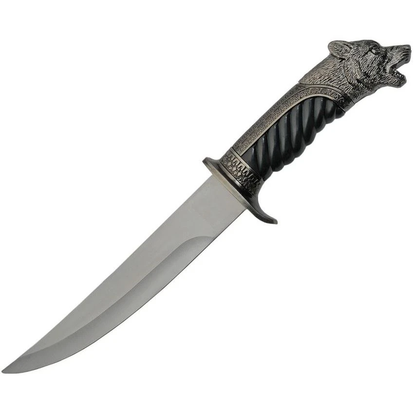Model – CN211471WSL. China Made 211471WSL – Wolf Pack Dagger. 13.75″ overall. 7.38″ satin finish stainless blade. Black synthetic and pewter handle with wolf shaped pommel. Black synthetic and pewter scabbard. Boxed. Made in China.