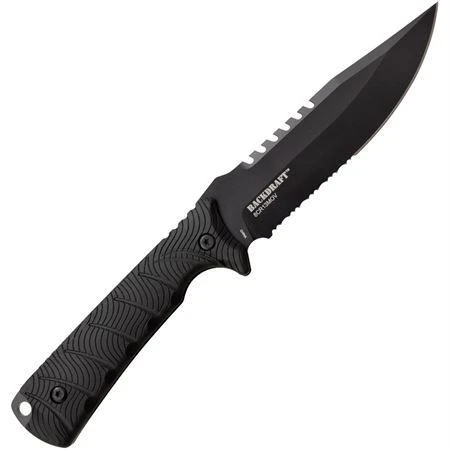 - 5″ (12.7cm) black finish partially serrated stainless blade