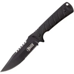 Model – ETFIX005BKS. Elite Tactical FIX005BKS – Tactical Bowie. 10″ (25.4cm) overall. 5″ (12.7cm) black finish partially serrated stainless blade. Black rubber handle. Full, extended tang. Lanyard hole. Black nylon belt sheath. Boxed. Made in China.