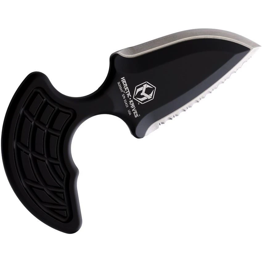 Model/Part Number – H0502C. Heretic Knives Sleight Push Dagger SW. 5.5″ (13.97cm) overall. 3″ (7.62cm) stonewash finish serrated CPM-20CV stainless blade. Black aluminum handle. Detachable double edge blade. Sheath compatible with all Sleight models. Black Kydex belt sheath. Boxed. Proudly made here in the USA.