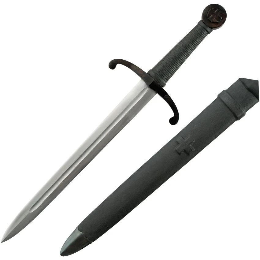 Model – IP613. Brookhart Hospitaller Dagger Fixed Blade Knife. 19.25 inch overall. 13 inch 5160 high carbon steel dagger blade. Traditional thru-tang peened construction. Blackened cruciform hilt and pommel. Black leather wrapped, wood core sheath. Bulk packed. Made in Philippines.