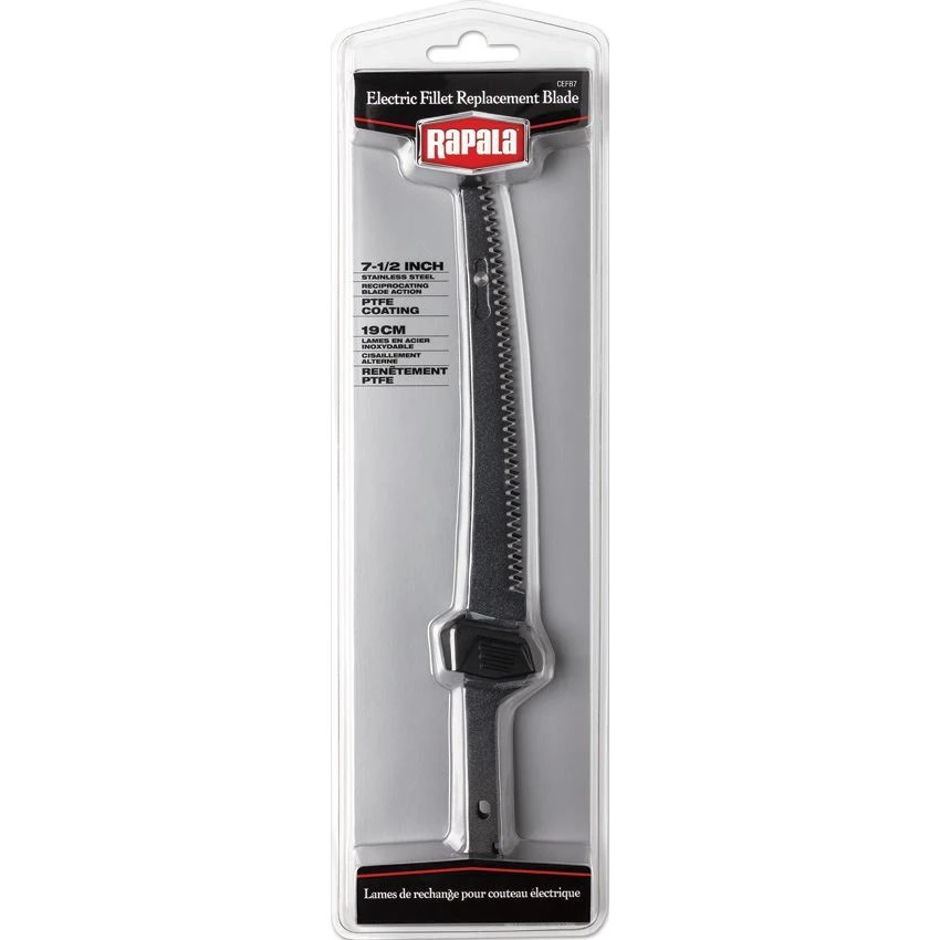Model – NK31876. Electric Fillet Replace Blade. 7.5 inch (19.05cm) black Teflon coated serrated stainless blade. Plastic safety grip. Reciprocating blade action. Designed for use with all Rapala electric and rechargeable knife models. Clam packed. Made in China