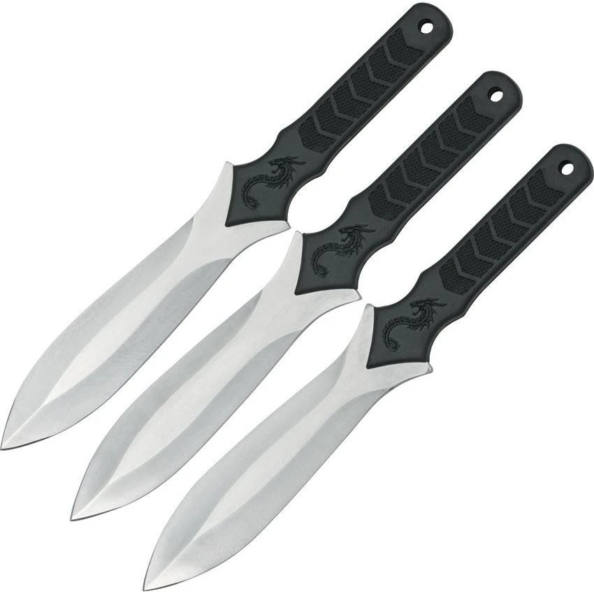 Model – CN210711. Rite Edge CN210711 – Rite Target Throwing Knives Fixed Blade Knife. Three Piece Throwing Knife Set. Knives are 9 3/4″ overall with 6″ 420 stainless double edge blades. Textured black composition handles. Lanyard hole. Black nylon belt sheath holds all. Made in China.