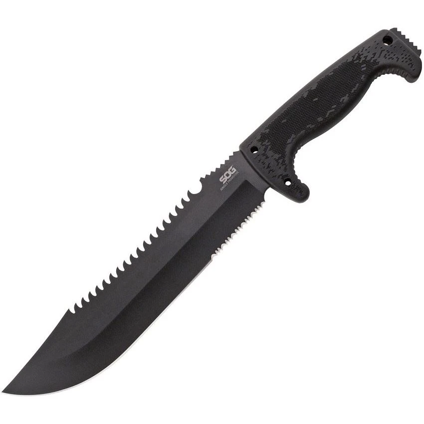 Model – SOGF03TNCP. SOG F03TNCP – Jungle Primitive. Overall: 15.25″; Blade: 9.5″ l 8Cr13MoV Stainless l Partially Serrated Edge; Handle: Black l Kraton; Other Info: Lanyard Hole. Black hardcase finish sawback bowie blade. Digi-Grip handles. Black ballistic nylon belt sheath. Hang Packaged. Made in China.