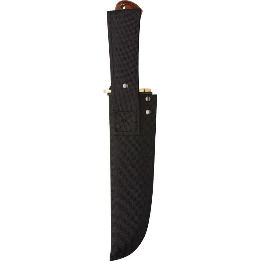 Model/Part Number – WN6220001W. Winchester Knives Bowie Wood. 14″ (35.56cm) overall. 8.75″ (22.23cm) satin finish stainless bowie blade. Brown wood handle. Brass guard. Lanyard hole. Black nylon belt sheath. Clam packed. Made in China.