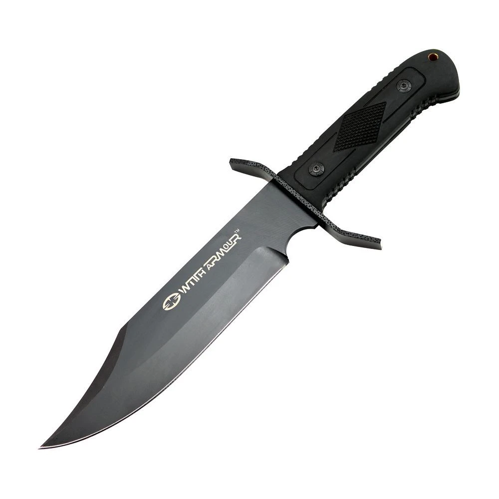 Model – WAR055BK. WithArmour Bowie Fixed Blade. Fixed Blade. Overall Length: 14.5″. Blade Length: 9″. Handle Length: 5.5″. Blade Thickness: 4.5mm. Steel Type: 440C. Leather sheath included. Made in China.